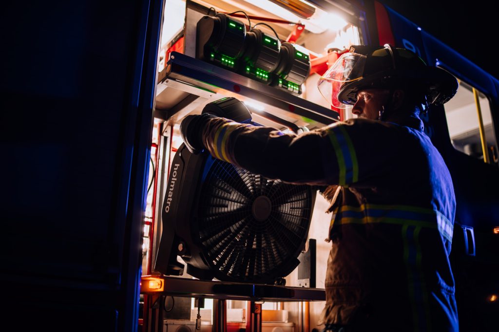 - Eine gemeinsame Akkuplattform – Die Akkus von Holmatro versorgen den Hochleistungslüfter, die akkubetriebene Pumpe, die Pentheon-Geräte, die OmniLock-Stützen und zukünftige Innovationen aus dem Hause Holmatro