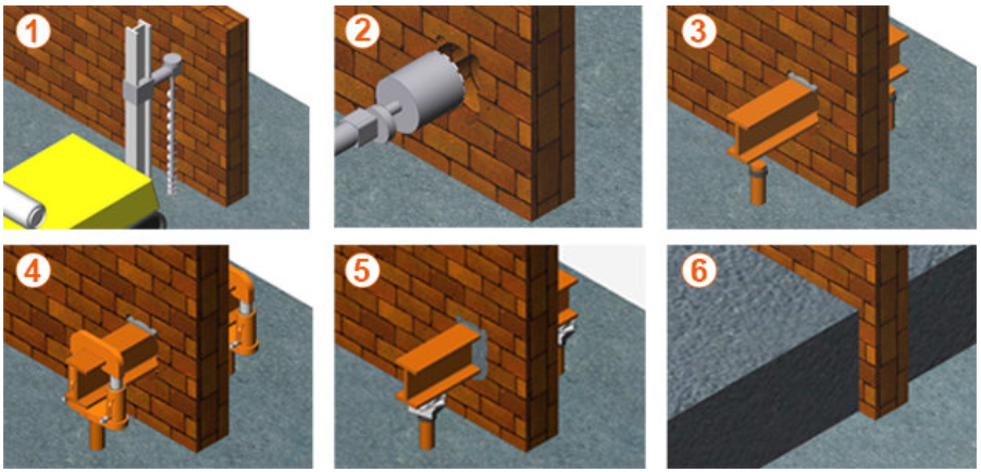 (1) Steel tubes were drilled into the ground on both sides of the castle walls. At the same time a mixture of cement and water was pumped in. Thus, the soil was not being removed, but blended with the mixture. When the tubes were drilled in deep enough, (2) a hole was drilled in the wall, (3) and a steel H-profile was positioned through it, resting on the tubes. On top of this a load spreading plate was fixed. (4) By means of multi purpose cylinders the H-beam was put under pressure. (5) Then, the resulting gap between the tubes and the beam was filled up with steel plates. (5 + 6) The surrounding floor and any gaps in the walls were filled up with concrete.