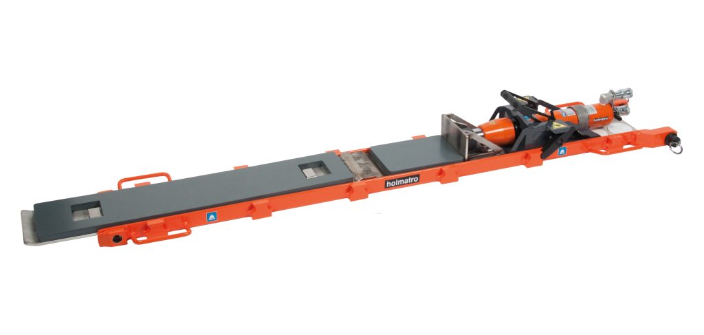 The essence of a skidding system is that relatively little force is required to move a heavy load horizontally. The tracks are easy to connect to each other by a click system. With a handle on the push-pull unit the push or pull direction of Holmatro’s lightweight Skidding System can be switched in a split of a second. The return line of the push-pull cylinders (each with a capacity of 10 tons) is internal, which significantly reduces the chances of this being damaged.