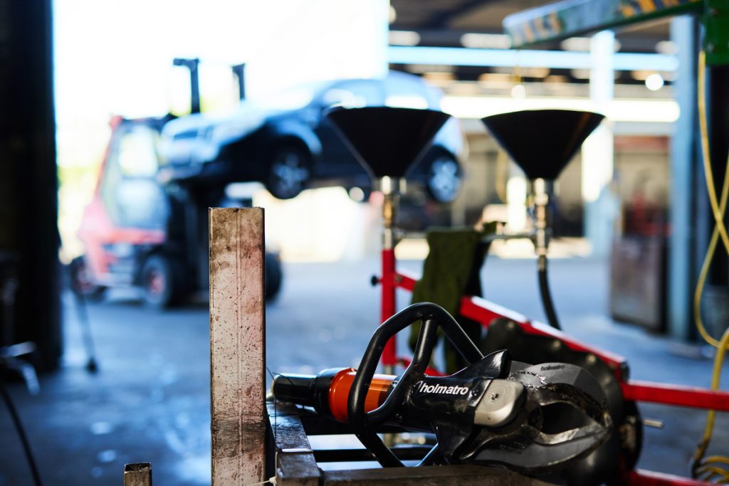 The HMC100A30 cutter is suitable for a variety of industrial cutting applications, e.g., car recycling or dismantling, demolition tasks, and metal/scrap recycling. Holmatro Mobile Cutters for industrial applications are specially developed for use ‘in the field’, making them ideal for various applications such as removing catalytic converters, demolition, and cutting cables. The key emphasis for these models is on mobility, enabling operators to carry out cutting tasks efficiently in diverse environments.